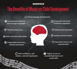 • Academic Achievement: Studies show that children who study music have better literacy, reading comprehension, and math skills. It can lead to higher test scores, with one study showing music students are up to 24% more likely to graduate and one year ahead of their peers.
